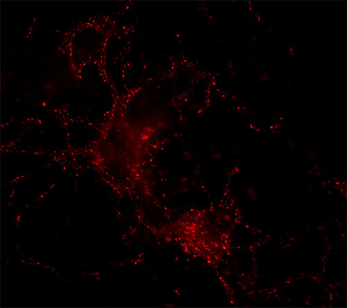 50 µg affinity purified Fab fragments, lyophilized. Rabbit serum albumin was added for stabilization. For reconstitution add 50 µl H2O to get a 1mg/ml solution of antibody in PBS. Either add 1:1 (v/v) glycerol (if this does not interfere with your experiments!), then aliquot and store at -20°C until use, or store aliquots at -80°C without additives. Reconstitute immediately upon receipt! Avoid bright light to minimize photo bleeching of the fluorescent dye. |