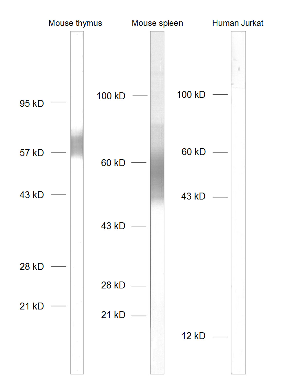 Reacts with: mouse (P06332). No signal: human (P01730), rat (P05540). Other species not tested yet. |