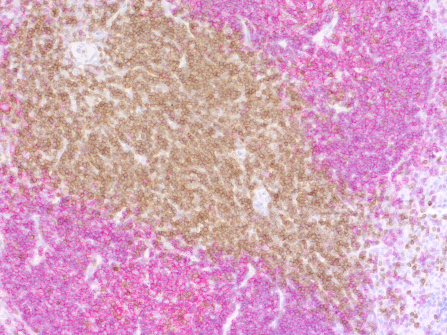 Cluster of differentiation 3 (CD3) is a defining feature of cells belonging to the T cell lineage. It is composed of the four subunits CD3 gamma, CD3 delta, CD3 epsilon (CD3e) and CD3 zeta, that form a multimeric protein complex. This complex associates with the T cell receptor (TCR) and serves as a T cell co-receptor. The CD3 molecules contain immunoreceptor tyrosine-based activation motifs (ITAMs) that serve as the nucleating point for the intracellular signal transduction machinery upon TCR engagement. TCR/CD3 signaling is central to the initiation of antigen-specific T cell responses to pathogens and vaccines, as well as transplanted tissues, tumors, and autoantigens. CD3 is initially expressed in the cytoplasm of pro-thymocytes. During T cell maturation the expression of CD3 migrates to the cell-membrane. The specific appearance at all stages of T cell development make CD3 a useful immunohistochemical marker for T cells in tissue sections. In the clinical setting, CD3 is a relevant marker for the classification of malignant lymphomas and leukemias as the antigen remains present in almost all T-cell lymphomas and leukemias. It can also be used to detect T cells in celiac disease, lymphocytic and collagenous colitis.