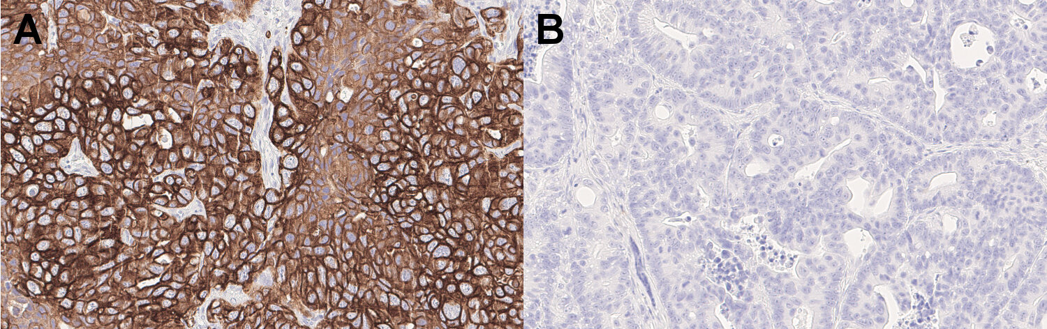 Cytokeratins are cytoskeleton proteins of epithelial tissues, contributing to the mechanical stabilization of the cells. The cytokeratin family consists of at least 20 isotypes, which are largely specific for particular organs or tissue types. Therefore, immunohistochemical staining of cytokeratins is clinically used for diagnosis of carcinomas, in particular of unclear metastases and in precise classification and subtyping of tumors (1). Cytokeratin 7 (CK7) is expressed in healthy bladder, in the female genital tract epithelium, in mesothelium and in the lung (2). In tumors, CK7 expression is found in the majority of carcinoma types, with the exception of those carcinomas arising from the colon, prostate, kidney and thymus (3). Furthermore, CK7 expression can have prognostic relevance, e.g. adverse prognostic factor in lung cancer (4), or predictive relevance, e.g. predictive factor of response to concurrent radiochemotherapy in advanced cervical cancer (5).