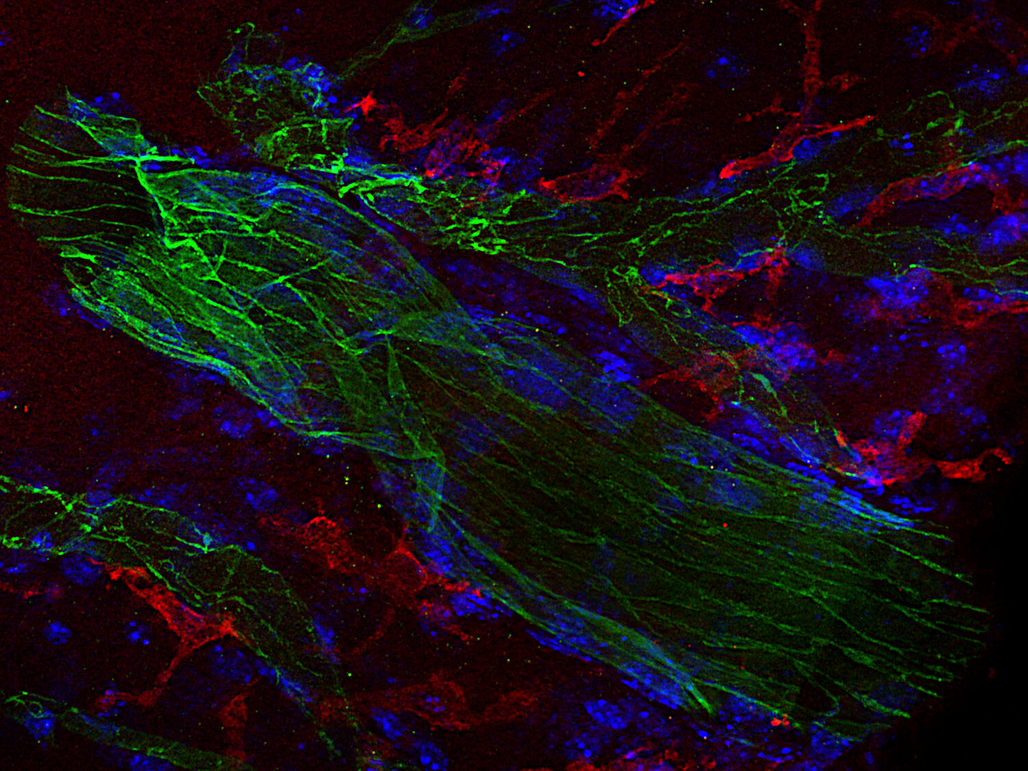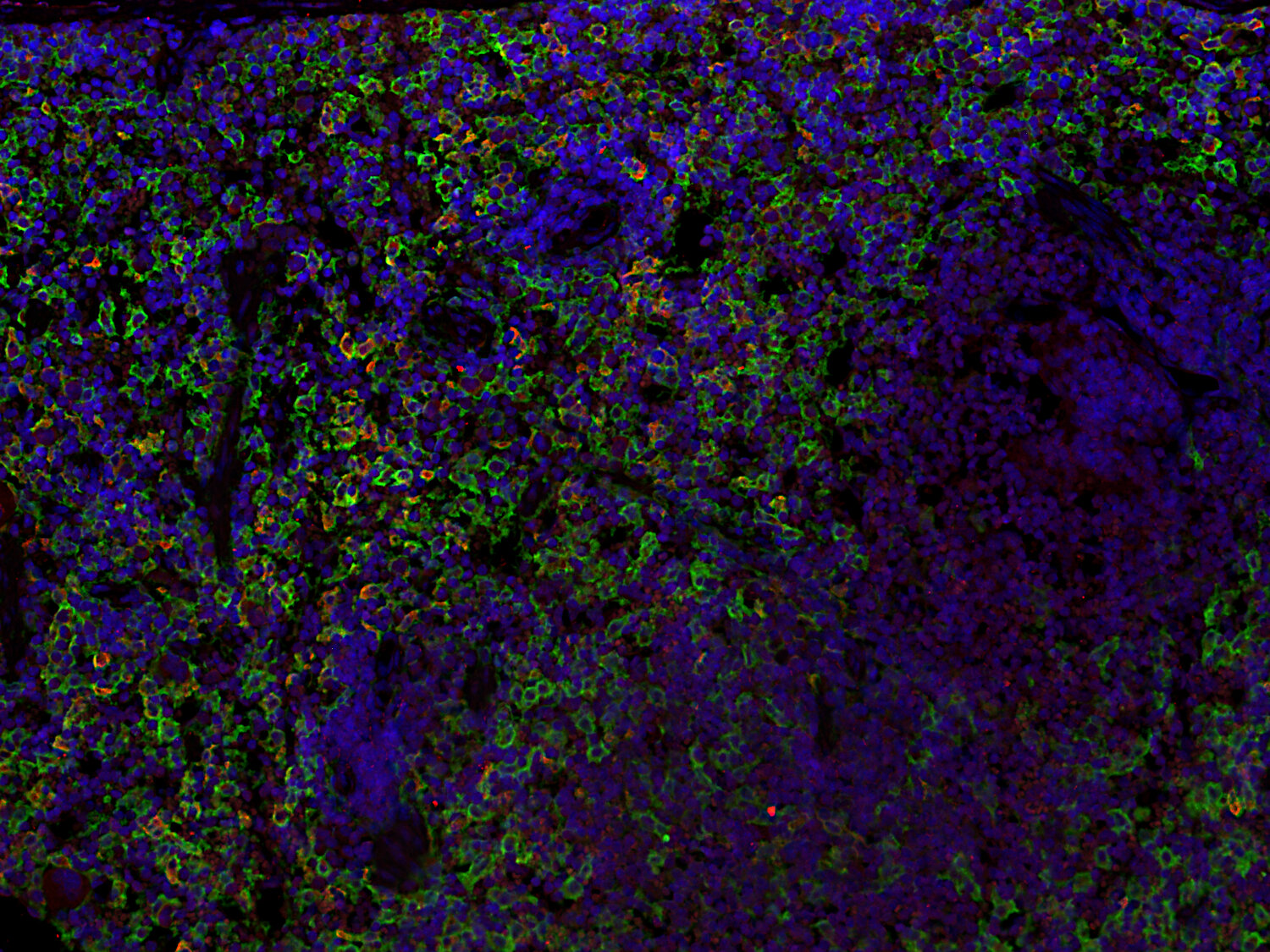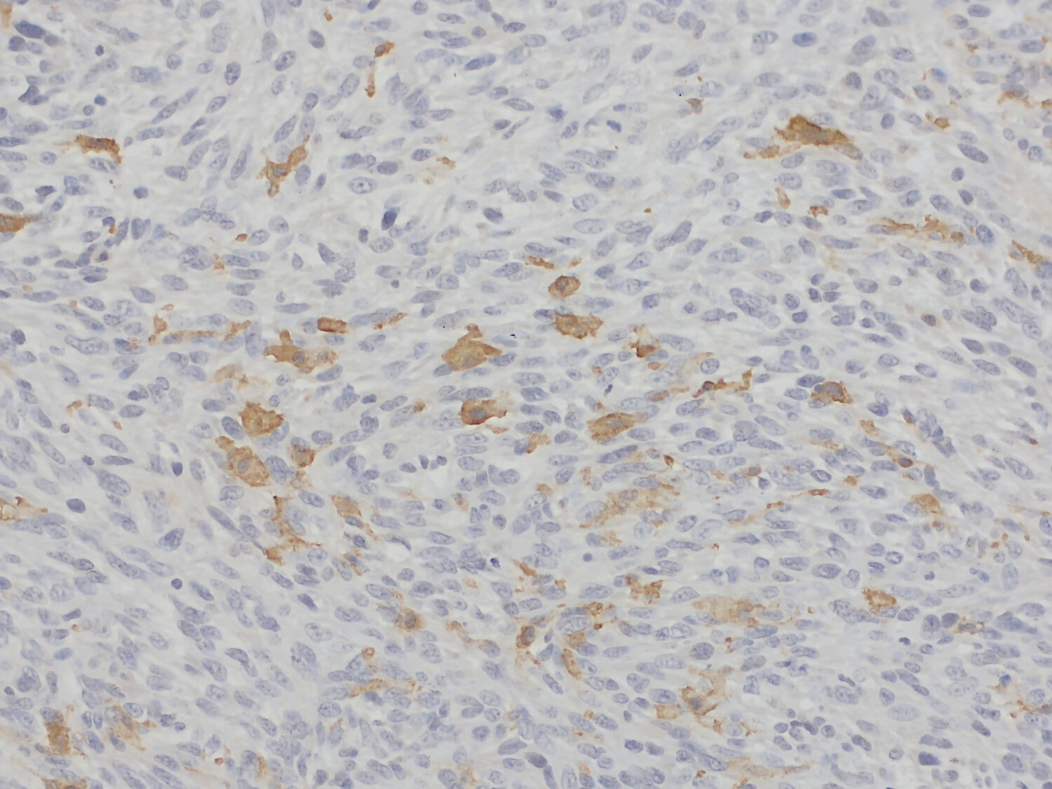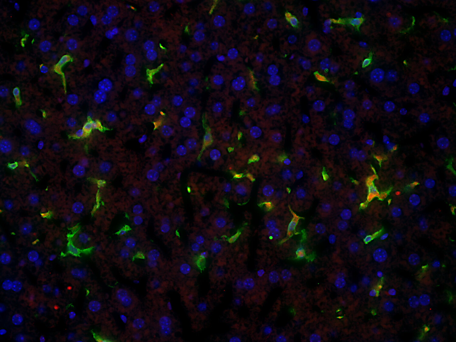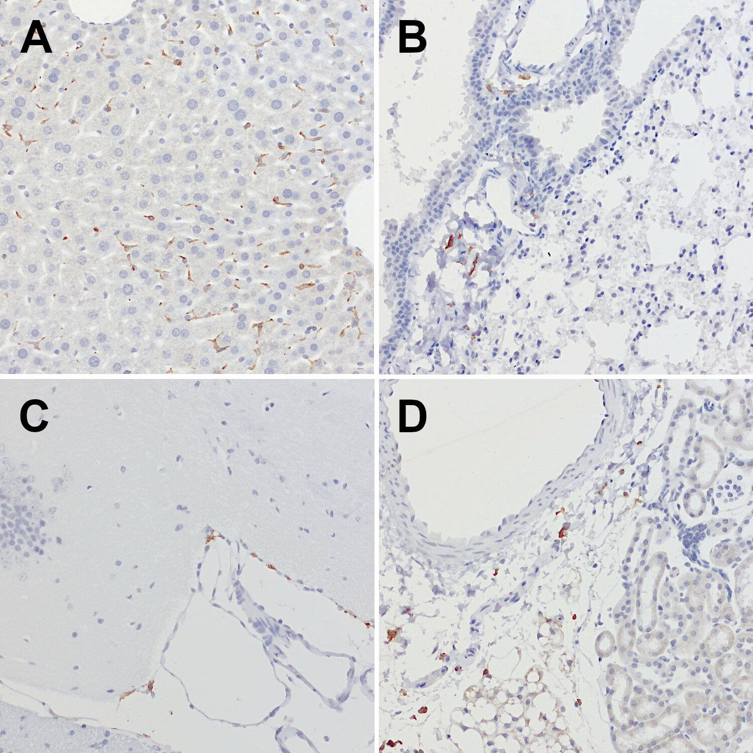 CD163 is a member of the group B scavenger receptor cysteine-rich (SRCR) superfamily expressed on human and murine macrophages. CD163 is also expressed in human monocytes, but not in circulating mouse monocytes (1). CD163 expression is significantly induced by anti-inflammatory stimuli like glucocorticoids and dexamethasone. Inflammatory stimuli like interferon γ and LPS suppress CD163 expression in macrophages (2). In mice, CD163 is mainly expressed by tissue-resident macrophages including Kupffer cells of the liver, red pulp macrophages in the spleen, perivascular macrophages of the CNS (3), and bone-marrow resident macrophages (4), but not by classical bone-marrow derived macrophages (4). In malignant tumors in mice and humans, macrophage CD163-mediated induction of IL-6 promotes tumor development and progression (4). The pool of tumor-associated macrophages (TAMs) is composed of both newly recruited monocyte derived macrophages and resident macrophages (5). CD163-positive tissue-resident macrophages have been shown to play a specific role in the malignant spread of disseminated tumor cells and the development of invasive disease in a mouse model of metastatic ovarian cancer (1). CD163 is considered useful to distinguish CD163-positive resident macrophages from CD163-negative bone-marrow derived macrophages in mice (4).