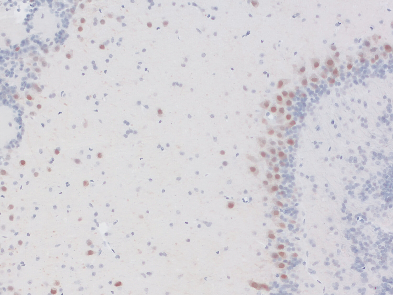 IHC-P: Antigen retrieval in pressure cooker is recommended. The antibody shows some unspecific staining in mouse cerebellum. |