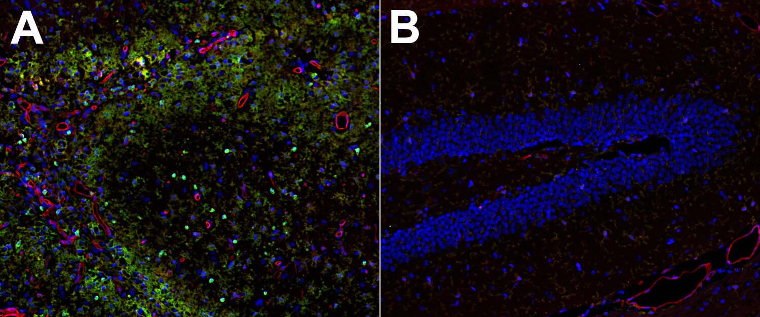 CD39, also known as ENTPD1 (ecto-nucleoside triphosphate diphosphohydrolase), is a cell surface ectoenzyme that catalyzes ATP and ADP into AMP, which is subsequently converted into adenosine by CD73 (NT5E, ecto-5′-nucleotidase). The balance between extracellular ATP and adenosine is crucial for immune homeostasis and is tightly controlled by enzymatic activity, with CD39 serving as the rate-limiting enzyme (1). CD39 is highly expressed on vascular and immune cell populations such as B cells, NK cells, dendritic cells, Langerhans cells, monocytes, macrophages, mesangial cells, neutrophils and regulatory T cells (2). High CD39 expression has been found in numerous cancers, either on the tumor surface or in infiltrating immune cells. Targeting the CD39/CD73 pathway is currently explored as a therapeutic strategy for cancer treatment (3). In the brain, CD39 is constitutively expressed by microglia, endothelial and smooth muscle cells of the vasculature and involved in microglial processes ramification (4) and blood-brain barrier function. Significant induction of CD39 protein in microglia has been demonstrated in several neuroinflammation models. CD39 up-regulation by reactive microglia is suggested to be associated with an anti-inflammatory phenotype (5).
