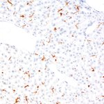 The murine CLEC4F is a hallmark of mouse Kupffer cells (KCs) and its expression distinguishes KCs and recruited macrophages (1). CLEC4F is a C-type lectin participating in the antigen presentation of glycolipid antigens, as well as in the recognition and scavenging of desialylated platelets (2). The human CLEC4F gene does not encode a functional receptor due to a mutation in the splice acceptor site of the final exon preventing the appropriate splicing and a missense mutation disrupts the sugar-binding site (3). CLEC4F colocalises with F4/80. Although F4/80 is constitutively expressed in peripheral and resident macrophages, CLEC4F is inducible in the liver and its expression appears when primitive macrophages migrate into the fetal liver. Moreover, CLEC4F and F4/80 cells in the liver increase after infection (4).