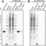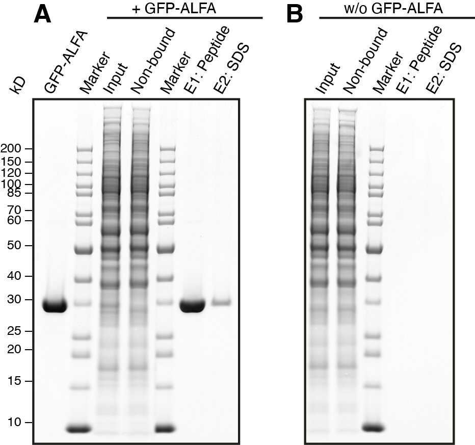 For immunoprecipitations we offer two types of ALFA Selector resins, tailor-made for specific requirements and applications. All ALFA Selectors are based on ALFA-tag specific nanobodies covalently immobilized on 4% cross-linked agarose or magnetic agarose beads. ALFA Selector ST (for Super-Tight) offers the highest possible affinity for ALFA-tagged targets, which can be eluted under acidic or denaturing conditions. ALFA Selector PE (for Peptide Elution) displays an engineered nanobody with lower affinity (Kd ~11 nM), which is optimized for peptide elution under physiological conditions. ALFA Selector CE (for Cold Elutable) carries an engineered nanobody with lower affinity (Kd 100 nM), which is optimized for peptide elution under physiological conditions at low temperature (4°C). All Selector resins feature low non-specific protein adsorption and therefore allowing clean and meaningful immunoprecipitations. Due to the covalent and oriented immobilization, the immobilized nanobodies will stay on the resin even when using harsh denaturing and/or reducing conditions for elution. In contrast to conventional immunoprecipitations, eluates from both ALFA Selectors will therefore be free from large amounts of antibody fragments.